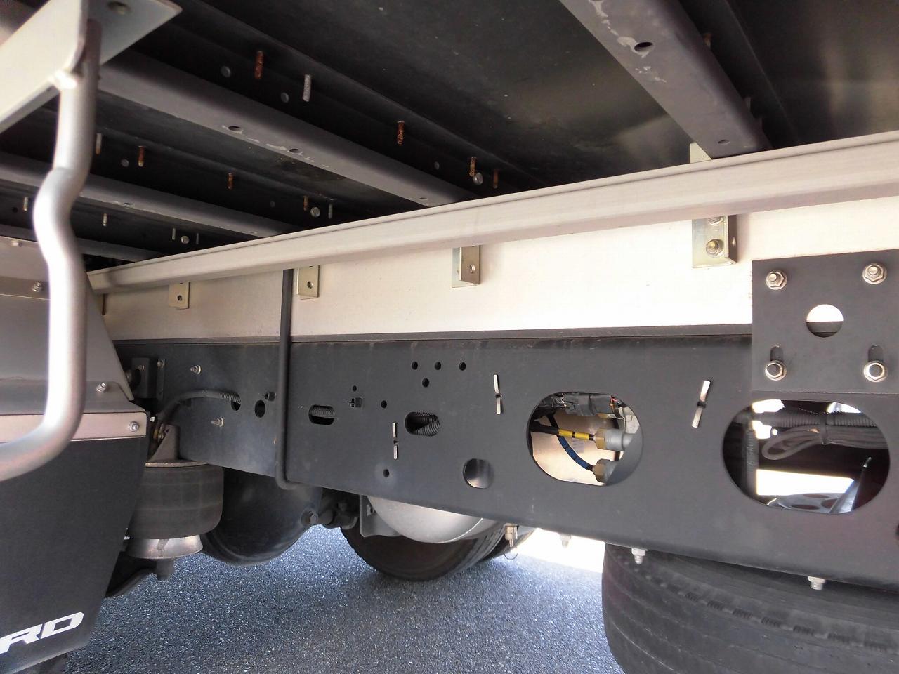 | リアエアサス、ラッシングレール2段、引き出しフック5対、カラーバックモニター、工具箱、純正導風板、エアサスシート、リモコンドアキー、メッキパーツ(Fバンパー、Fグリル、ミラーカバー)、室内清掃済み、床板所々傷・補修跡あり、導風板傷、右ウイングコルゲート傷、運転席シート擦れ、Fガラス小さな傷あり |